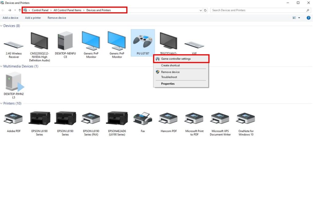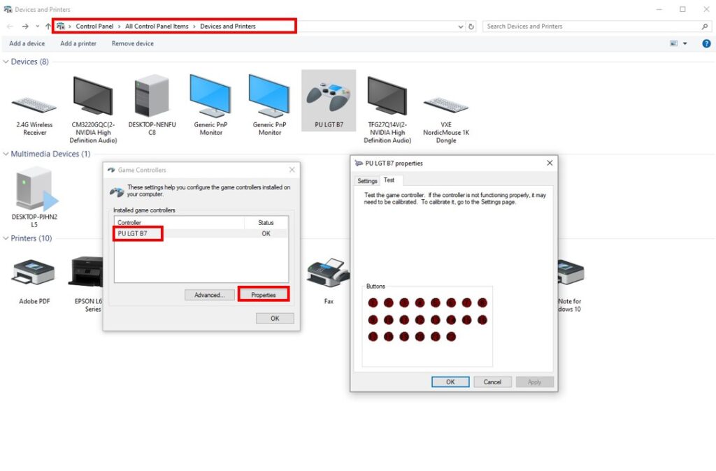 2. Go to Windows → Devices and Printers → Game Controller Settings → Properties